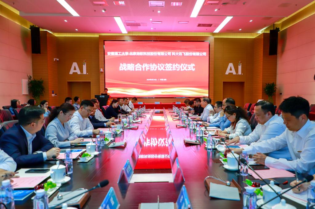 安徽理工大學科研部負責人劉輝,龍軟科技董事、副總經(jīng)理高志譽,科大訊飛副總裁、安徽大區(qū)總經(jīng)理李紅明分別代表三方簽約。中國工程院院士、安徽理工大學黨委副書記、校長袁亮,北京大學教授、龍軟科技董事長毛善君,科大訊飛董事長劉慶峰等出席并見證簽約。