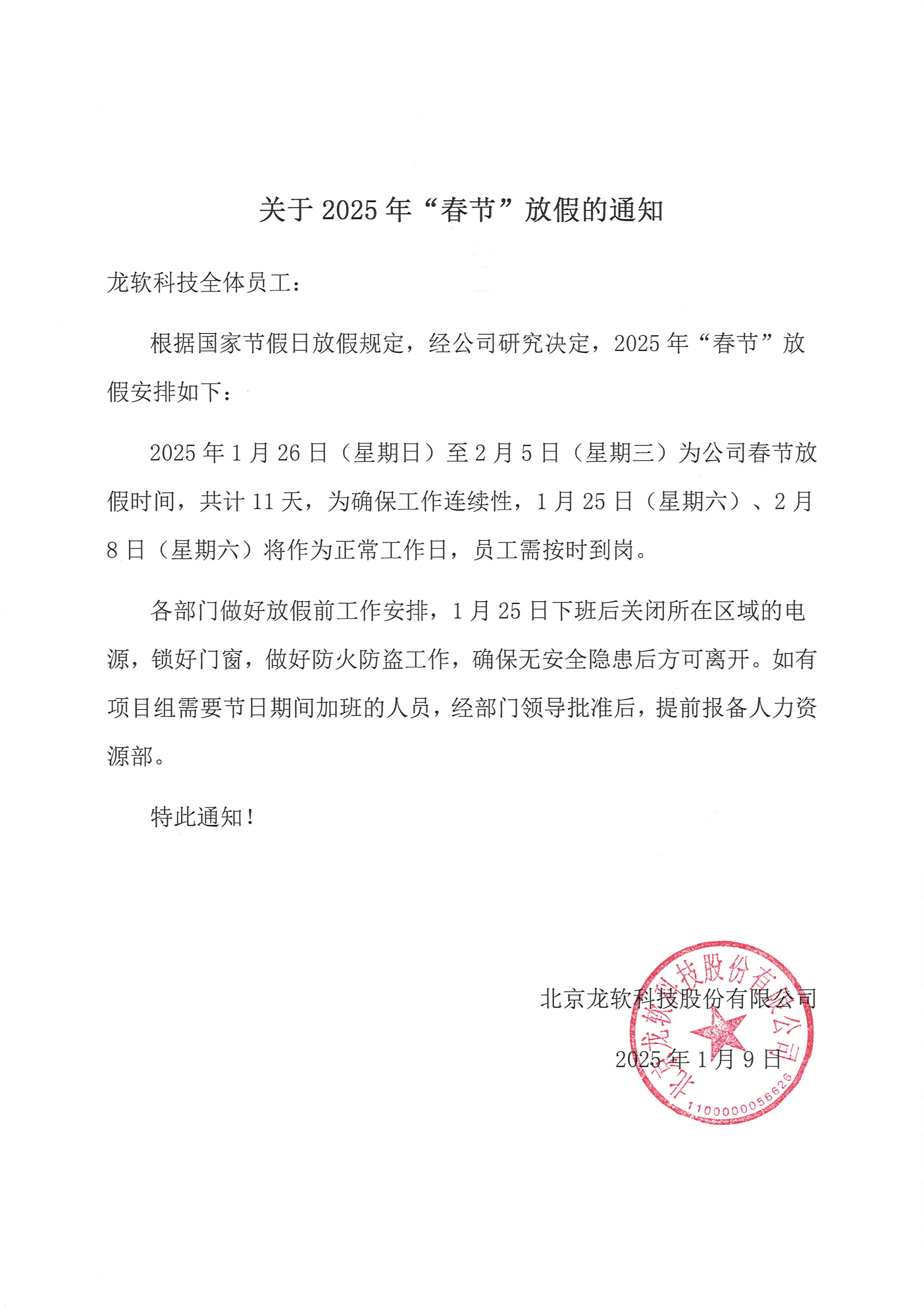 關(guān)于2025年春節(jié)放假的通知
