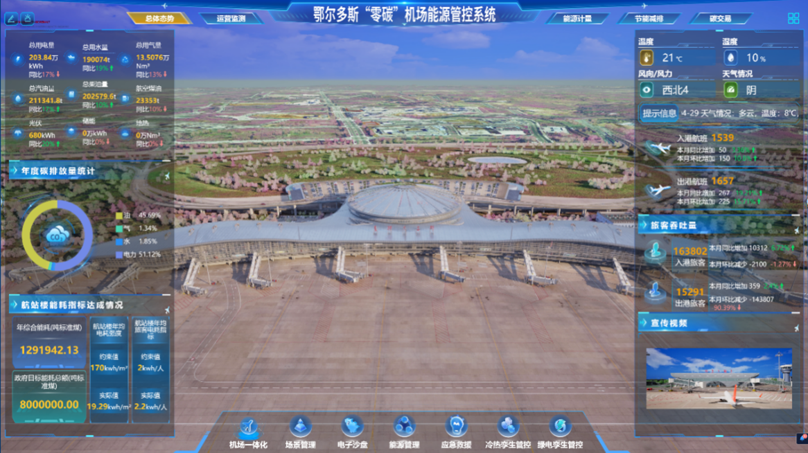 作為北京大學(xué)鄂爾多斯能源研究院的戰(zhàn)略合作伙伴,龍軟科技負(fù)責(zé)建設(shè)了鄂爾多斯“零碳機(jī)場(chǎng)”能源管控系統(tǒng),該系統(tǒng)圍繞“數(shù)字孿生賦能管理決策,鄂爾多斯機(jī)場(chǎng)智控減碳”的建設(shè)目標(biāo),應(yīng)用無(wú)人機(jī)傾斜攝影測(cè)量、三維激光掃描等建模技術(shù),構(gòu)建了鄂爾多斯伊金霍洛國(guó)際機(jī)場(chǎng)全息三維數(shù)字化模型;利用大數(shù)據(jù)、人工智能和虛擬現(xiàn)實(shí)等技術(shù),整合機(jī)場(chǎng)空間靜態(tài)數(shù)據(jù)和實(shí)時(shí)動(dòng)態(tài)數(shù)據(jù),通過(guò)對(duì)機(jī)場(chǎng) “綠電、網(wǎng)電、儲(chǔ)能、冷熱”能源供應(yīng)和(水、電、油、氣)能源消耗的集中監(jiān)測(cè),實(shí)現(xiàn)機(jī)場(chǎng)多源能耗監(jiān)管、能源集中管控、碳足跡計(jì)量分析等功能。