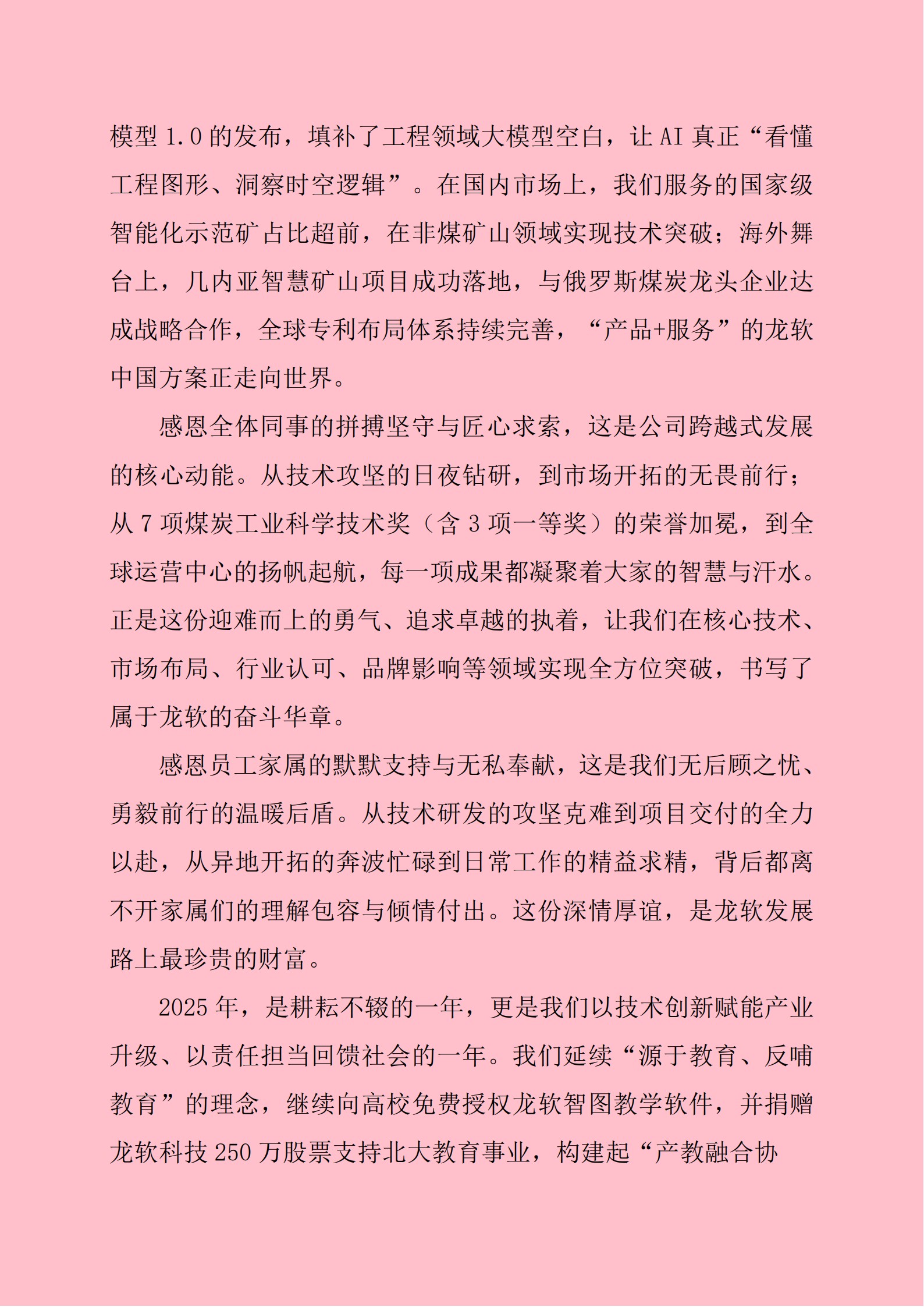 2025年1月,第十二屆北京大學(xué)地球與空間科學(xué)學(xué)院“龍軟科技”獎(jiǎng)教金頒獎(jiǎng)典禮順利舉行,公司延續(xù)12年捐贈(zèng)傳統(tǒng),本年度出資獎(jiǎng)勵(lì)10名優(yōu)秀教師與56名碩士、博士研究生,累計(jì)已資助62位教師及484名學(xué)子。針對(duì)行業(yè)人才需求,公司在原有獎(jiǎng)學(xué)金基礎(chǔ)上,聯(lián)合中國(guó)礦業(yè)大學(xué)(北京)教育基金會(huì)優(yōu)化“龍軟科技智慧礦山優(yōu)秀學(xué)生獎(jiǎng)學(xué)金”,增設(shè)“卓越獎(jiǎng)學(xué)金”類別,覆蓋智能采礦、人工智能等11個(gè)核心專業(yè),其中10名獲卓越獎(jiǎng)學(xué)金的學(xué)生已通過(guò)企業(yè)實(shí)習(xí)考核獲得優(yōu)先錄用資格。
